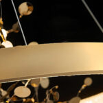 Le cercle lumineux cuivré diffuse un éclairage blanc chaud parfaitement homogène. Mais c’est au contact des feuilles en métal que la magie opère : la lumière se reflète, se démultiplie et se projette subtilement sur les murs, créant un jeu de lumière mouvant et immersif.