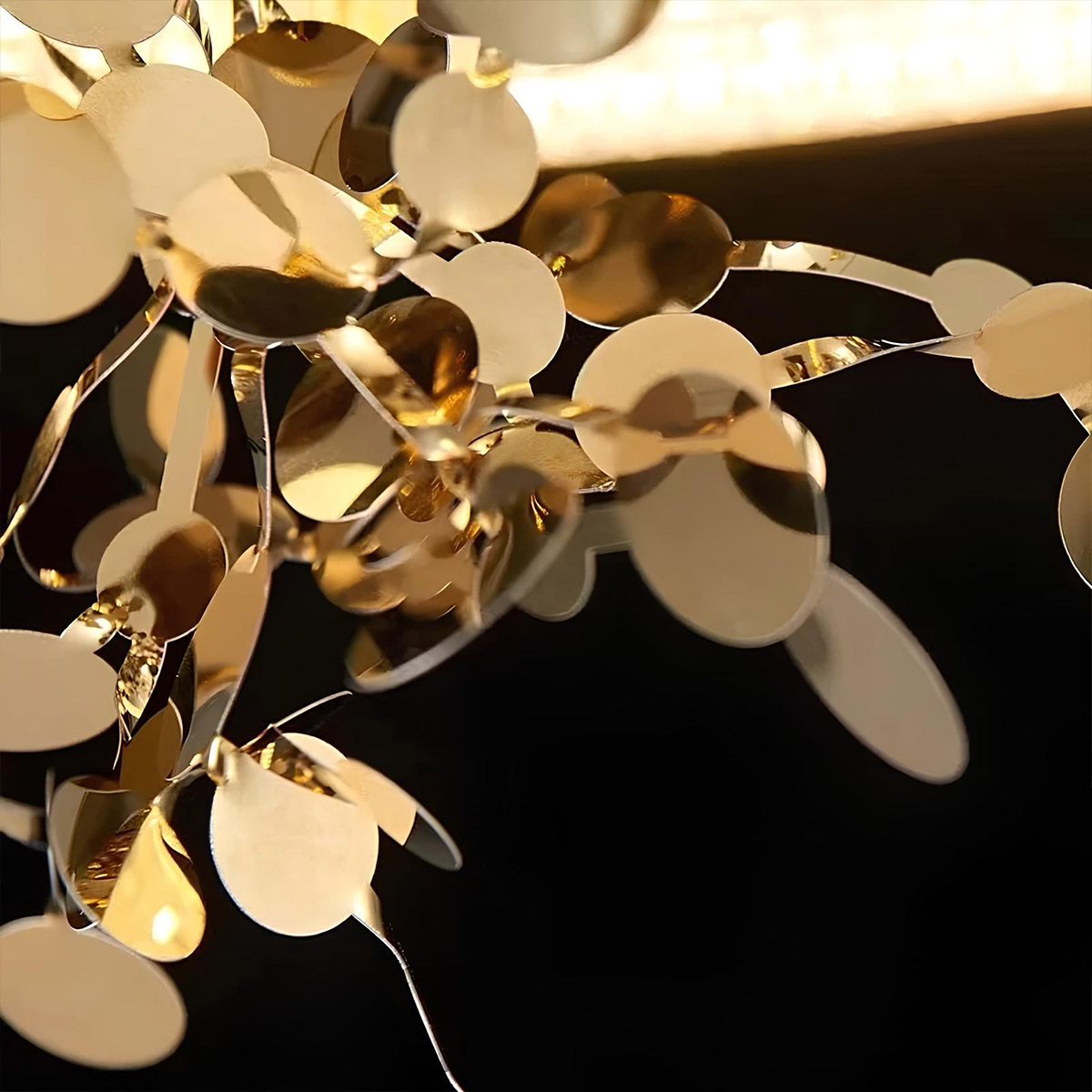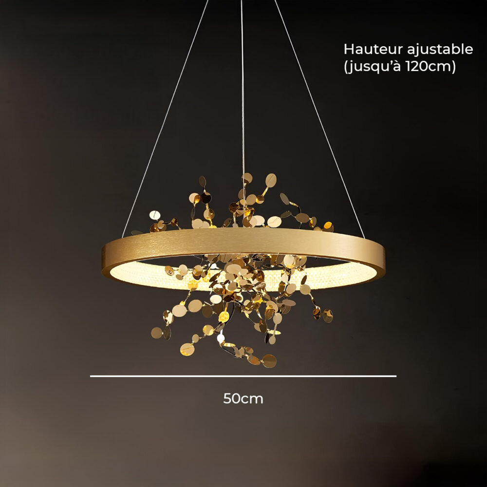 Ce luminaire séduit d’abord par sa structure aérienne : un cercle cuivré abrite un feuillage stylisé en acier inoxydable, à la fois dense et délicat. Les feuilles métalliques, finement découpées, rappellent les mouvements gracieux des feuilles dans la nature.